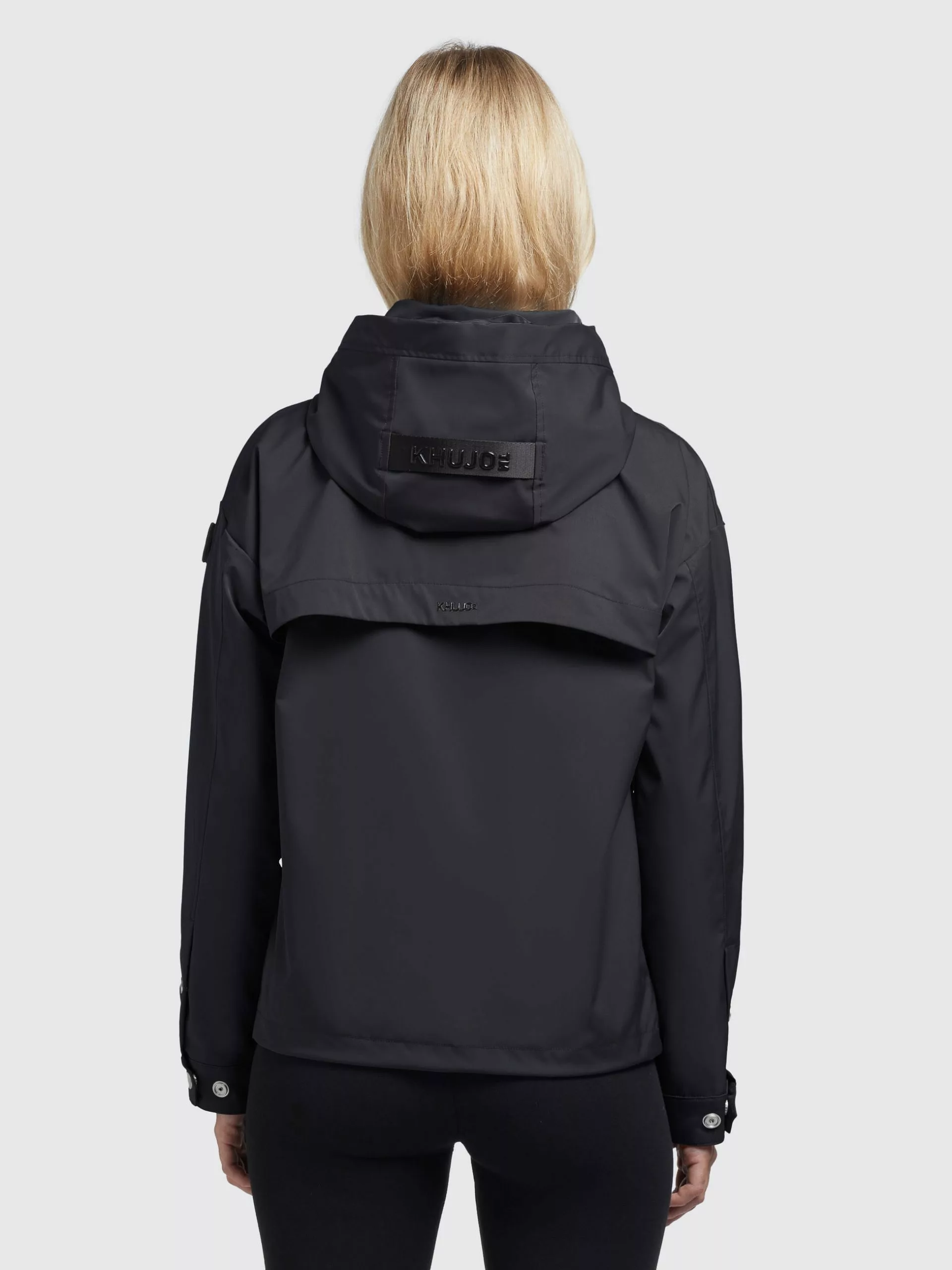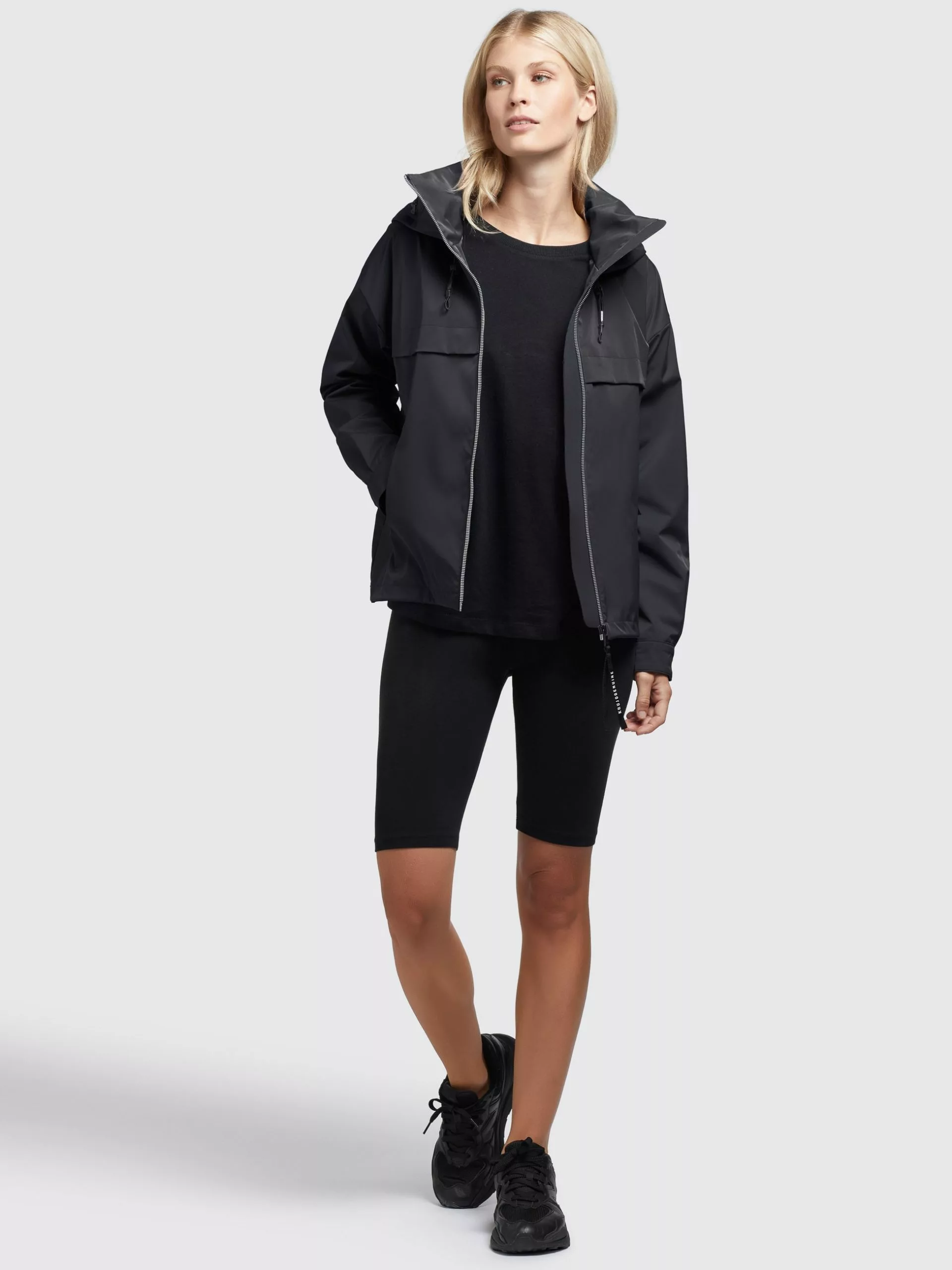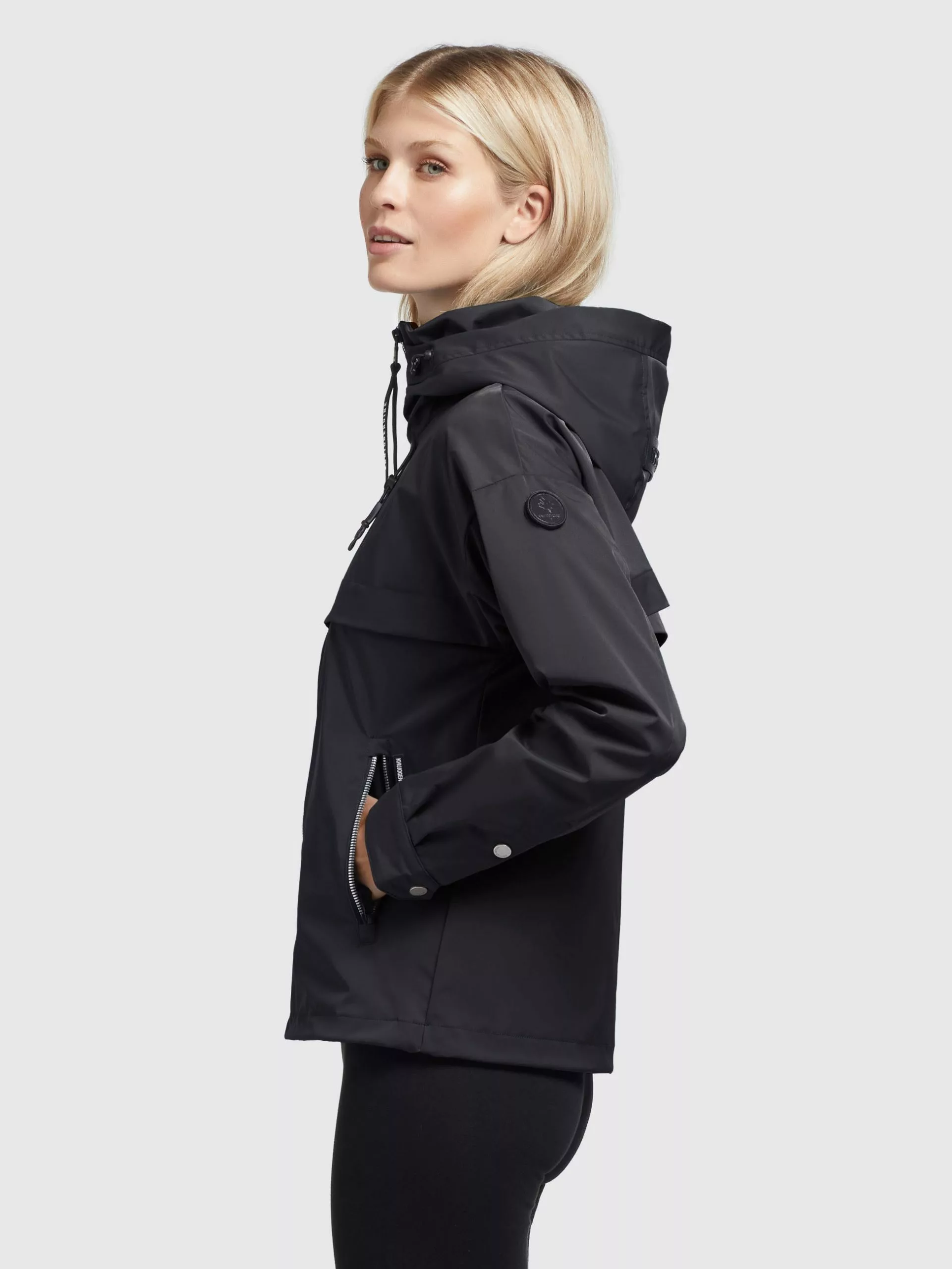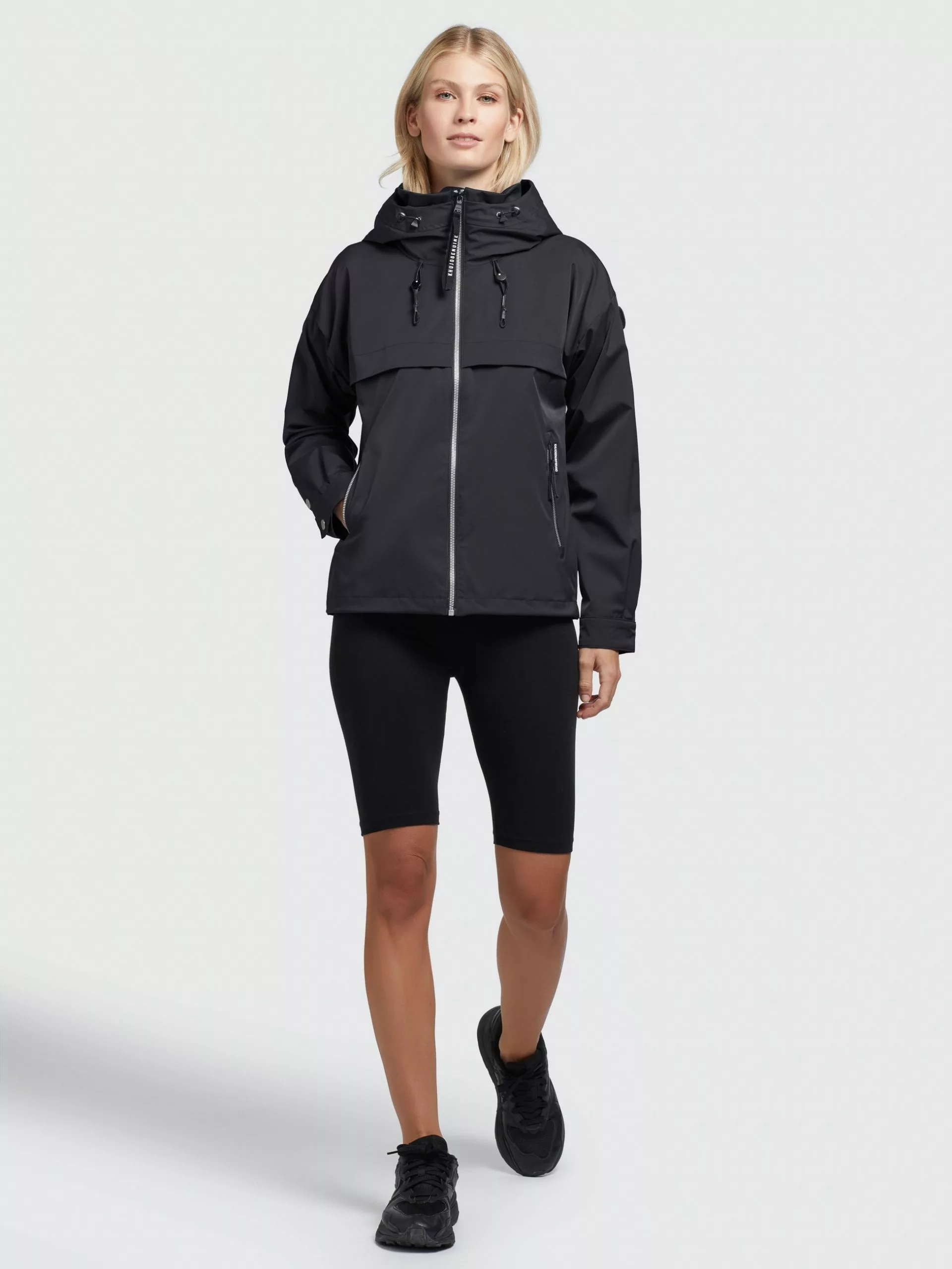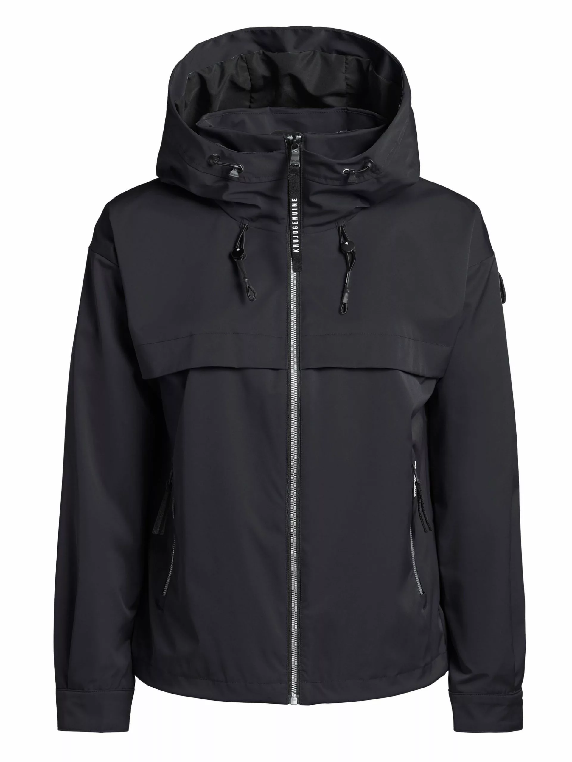 – hoch schließende Kapuze mit Kordelzug