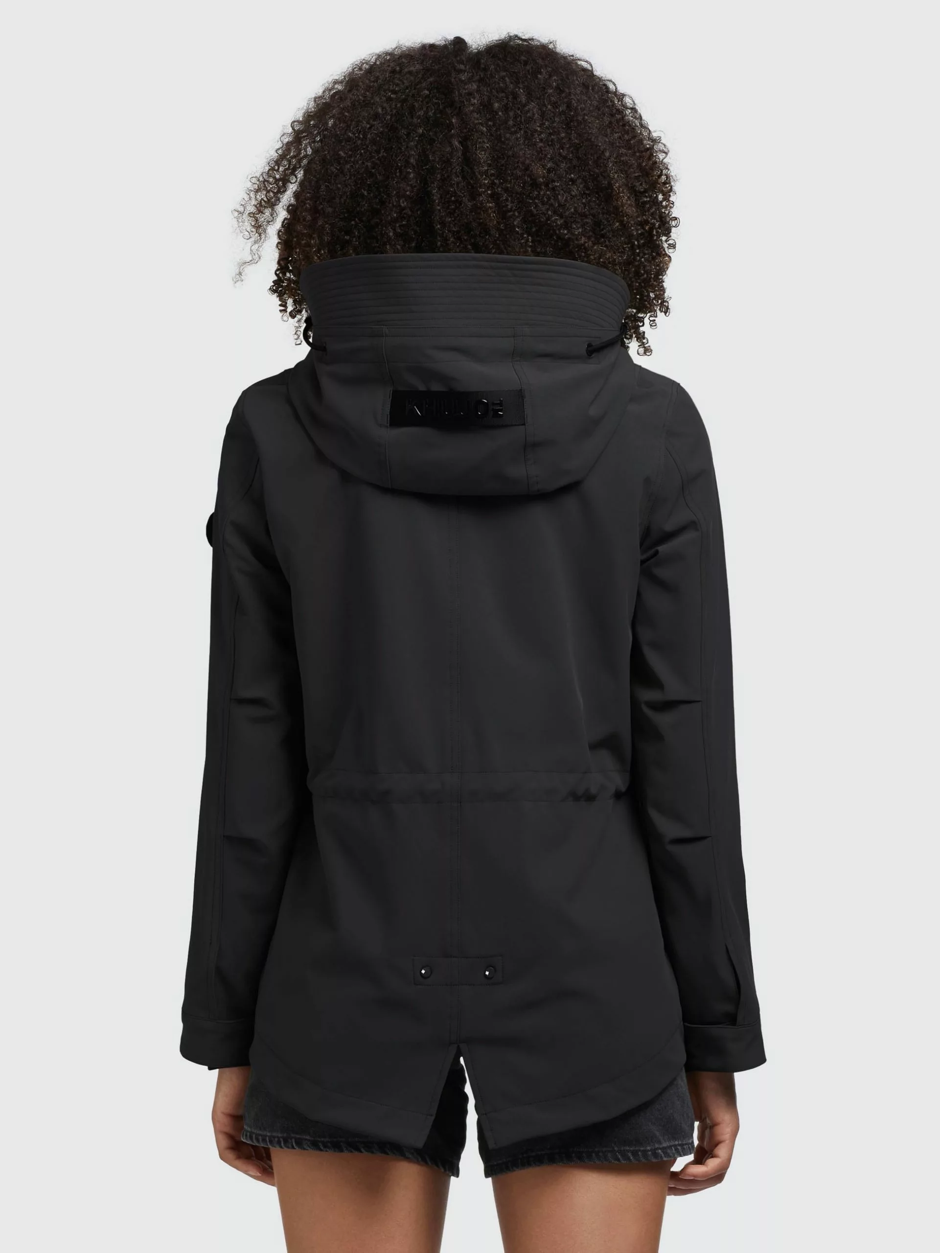 – hoch schließende Kapuze mit Kordelzug