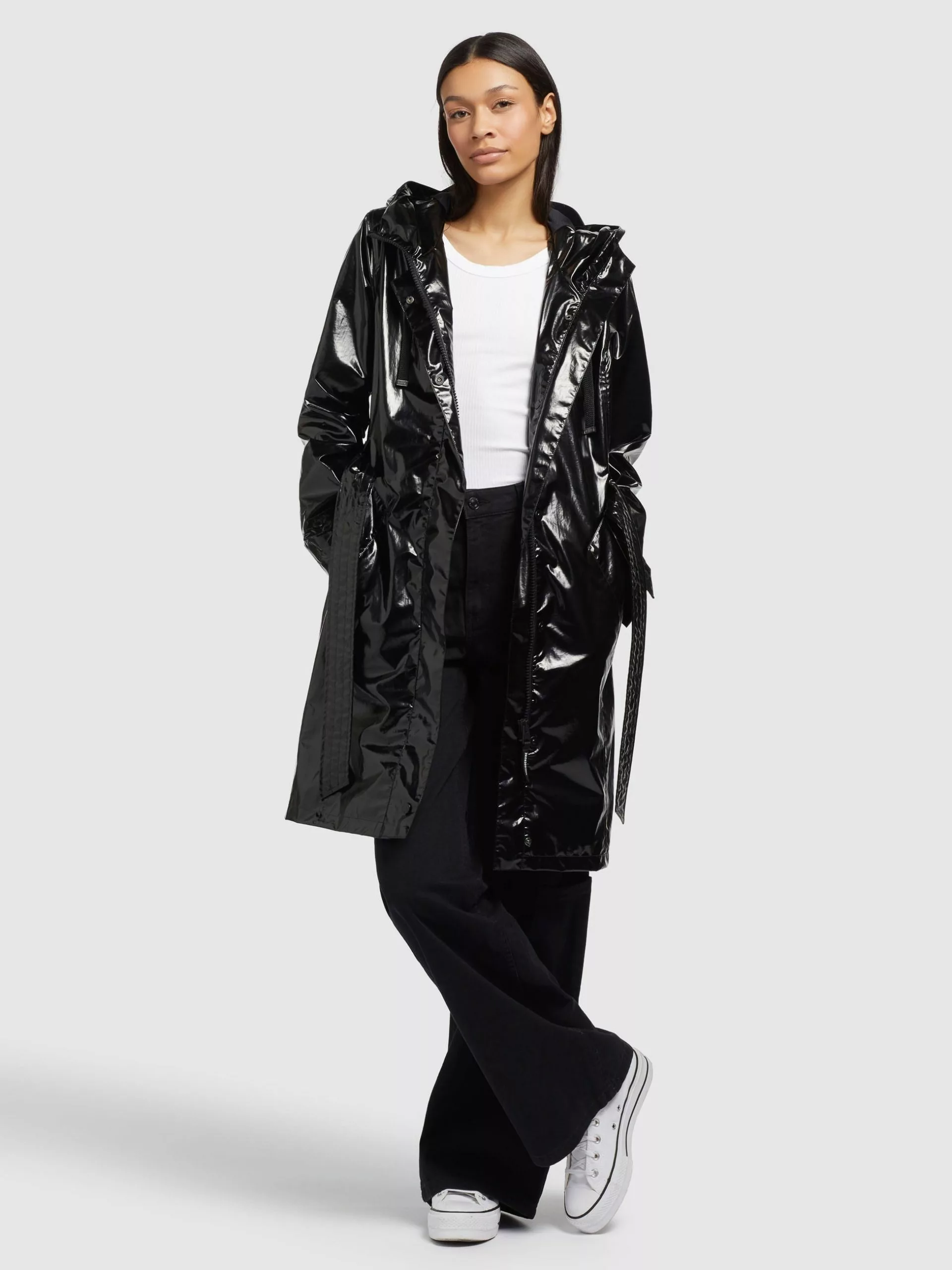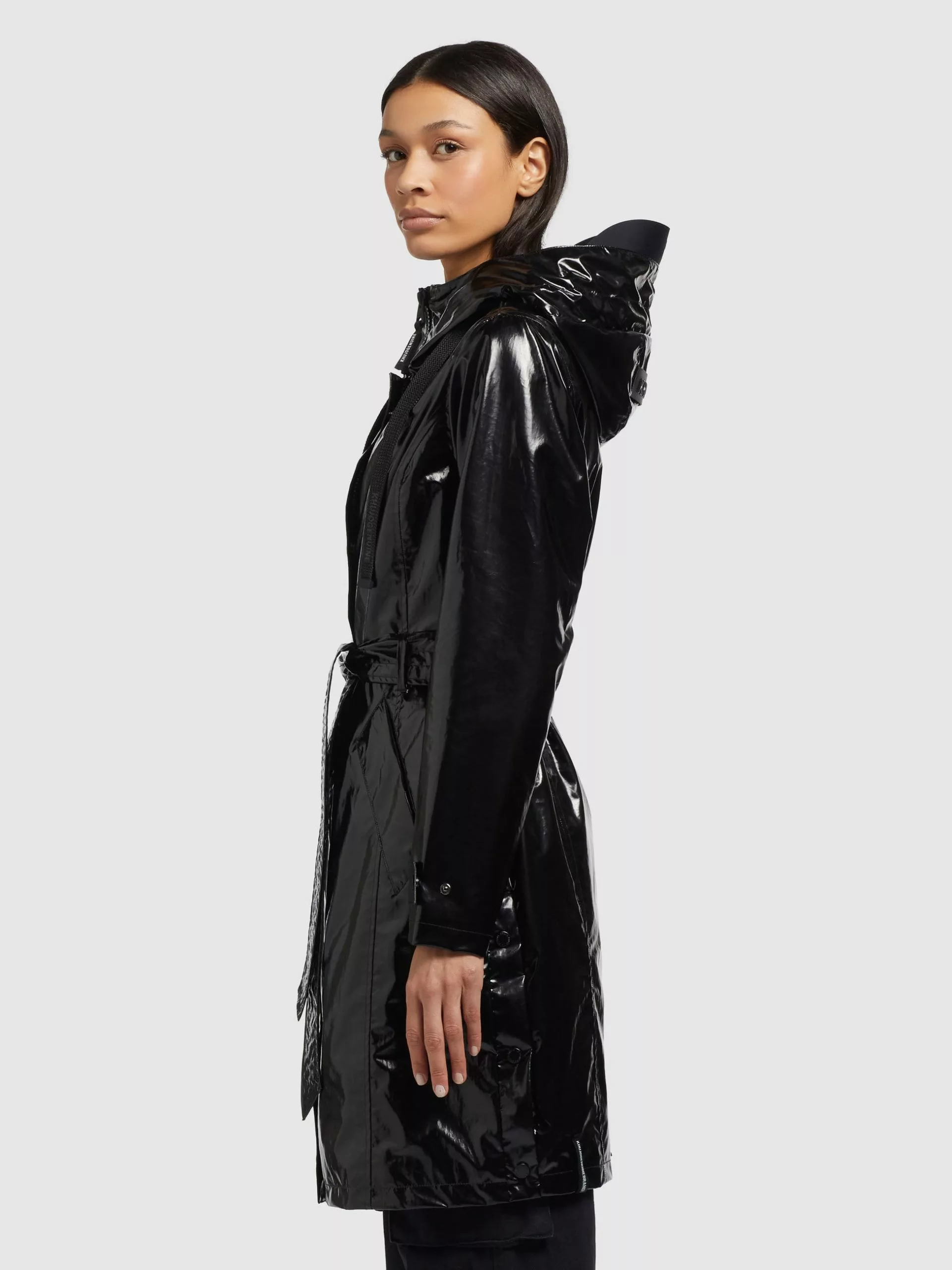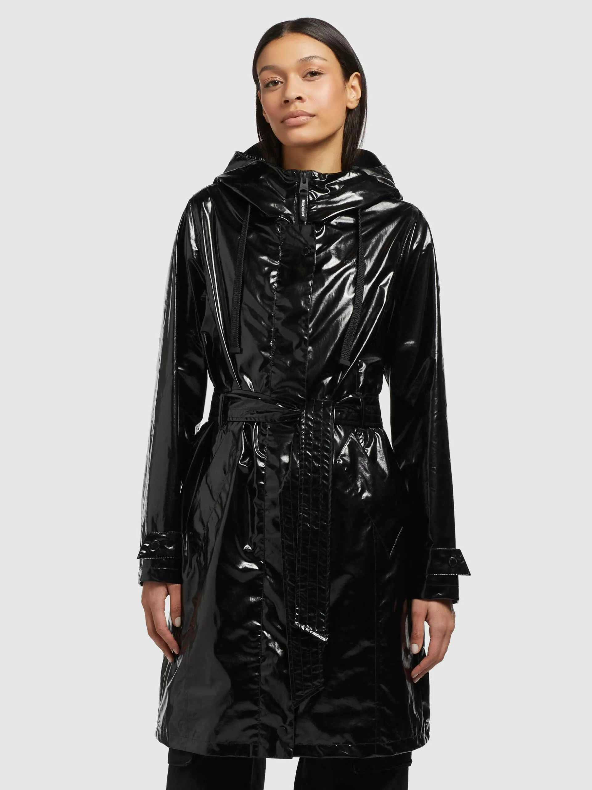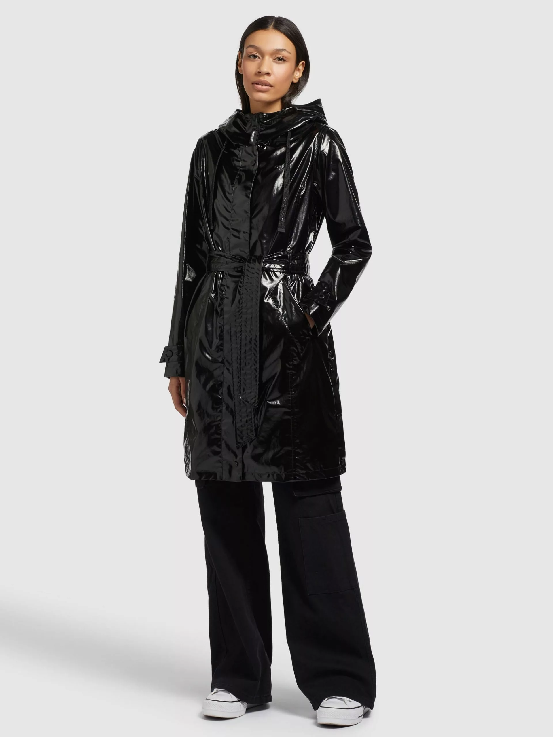 Der glänzende khujo Mantel ALECIA ist eine Mischung aus Trenchcoat und Regenmantel. Dank einem wasserabweisenden Obermaterial, einer Kapuze mit Meshfutter und Kordelzug, Seitenschlitzen mit Druckknöpfen sowie Belüftungsösen unter den Armen und einem Mesheinsatz im Innenfutter bietet der Sommermantel einen angenehmen Tragekomfort. Ein abnehmbarer Stoffgürtel, ein Reißverschluss mit Magnetknopfleiste, Eingrifftaschen und eine Innentasche runden das Desgin bei diesem Kurzmantel gelungen ab.